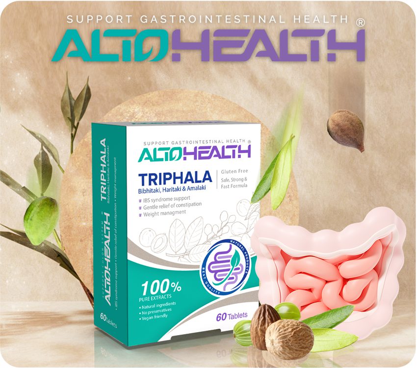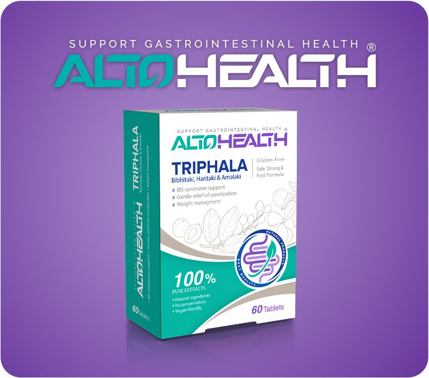 ALTOHEALTH contains triphala 750 mg. triphala is an herbal formulation of three dried friuts from herbal plants in equal proportion: Terminaliachebula, Terminalia bellirica and phyllantus emblica. Triphala have benefical effect on the entire gastrointestinal (GI) tract. Triphala improve lower GI symptoms and maybe a valuable and effective addition to standard treatmenr of IBS.