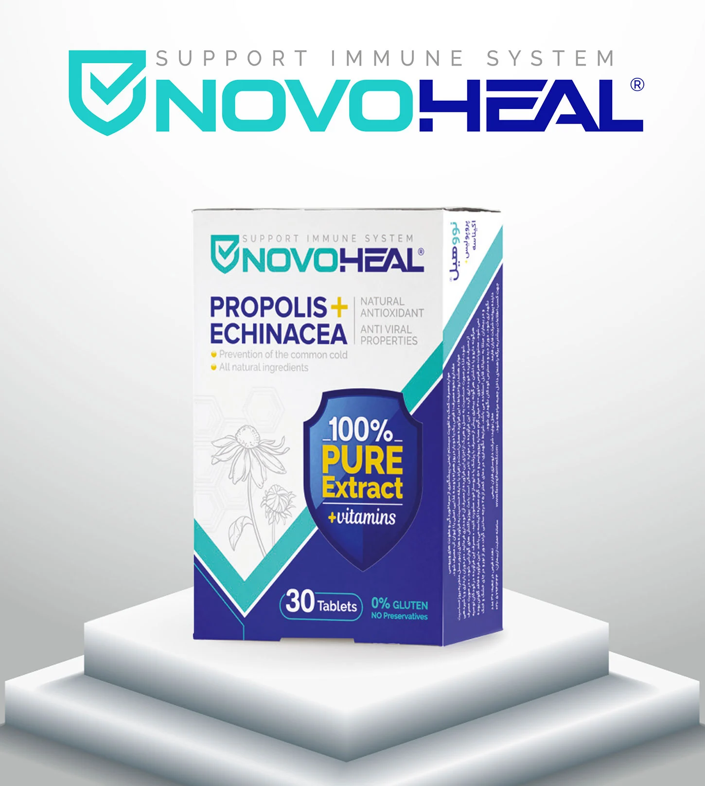 در ترکیبات قرص Novoheal از اکیناسه و پروپولیس استفاده شده است که سبب تقویت سیستم ایمنی بدن میشود. پروپولیس ترکیبی است که از کندوی زنبور عسل به دست میآید و قوی ترین سد دفاعی زنبور در برابر عوامل عفونی و مهاجم به کندو است. این صمع جمع آوری شده توسط زنبورهای عسل حاوی انواع ترکیبات شیمیایی مانند استروئیدها، اسیدهای آمینه، ترپنوئیدها و ترکیبات غیر آلی است. طبق تحقیقات انجام شده در سالهای اخیر، این ماده شگفت انگیز دارای اثرات ضد باکتریایی، ضد ویروسی، ضد قارچی، ضد التهابی، و آنتی اکسیدانی بوده و همچنین به عنوان تقویت کننده سیستم ایمنی بدن کاربرد دارد.